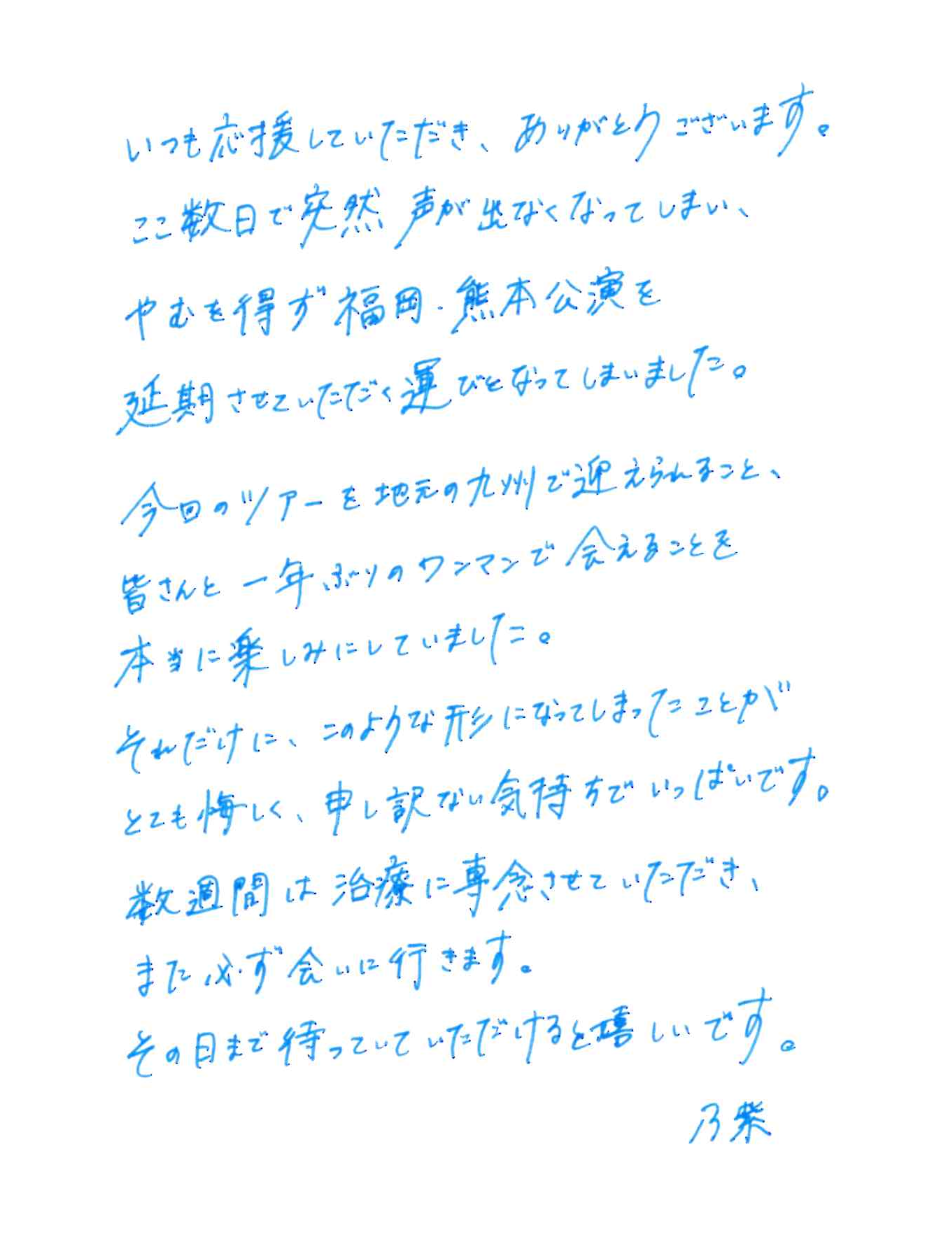 と4月5日(日)熊本B.9 V1熊本公演につきまして、喉の不調により、やむを得ず延期とさせていただくこととなりました。
